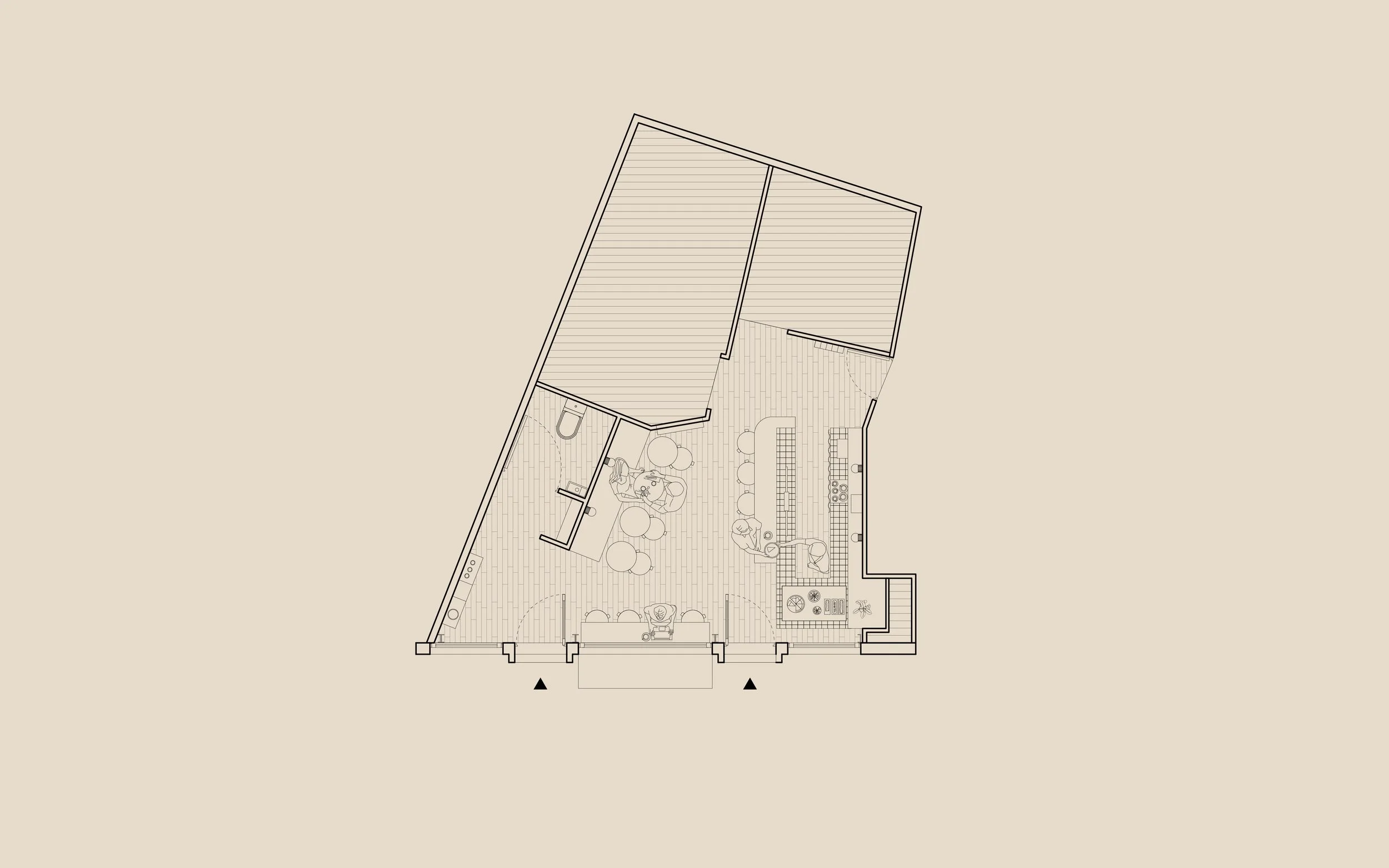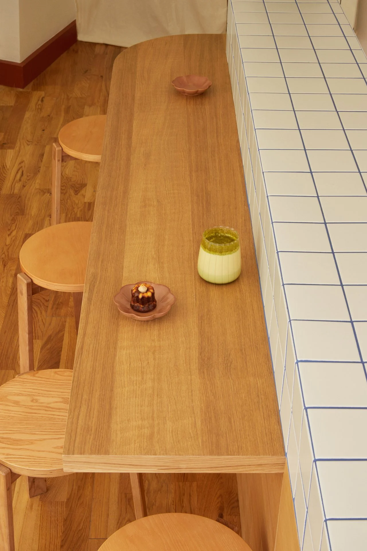 Nous avons travaillé l’espace et la circulation du café autour d’une vitrine généreuse et gourmande. Baigné par une lumière d’est douce et chaude, l’espace se compose d’un comptoir pouvant accueillir 4 places assises, de 4 tables de 2 personnes et d’un mange debout pour 2 personnes.